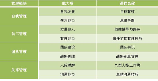 管理類課程體系和軟性技能相關(guān),主要包括自我管理、員工管理、團隊管理和關(guān)系管理四大模塊。