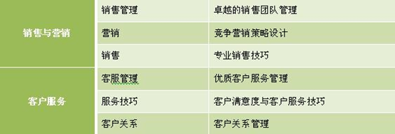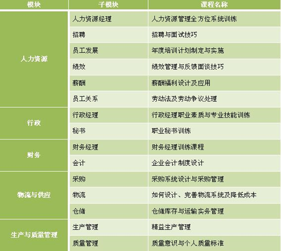 公司各個組織單元下的職能可以進行進一步的細分,根據(jù)細分的職能就可以確定專業(yè)方向上的培訓(xùn)課程體系。人力資源單元可以分為人力資源管理、招聘、員工發(fā)展、績效、薪酬、員工關(guān)系;行政單元可以分為行政管理、秘書;財務(wù)單元可以分為財務(wù)管理、會計、審計;物流與供應(yīng)單元可以分為采購、物流、倉儲;生產(chǎn)與質(zhì)量管理單元可以分為生產(chǎn)管理、現(xiàn)場管理、流程管理、質(zhì)量管理、過程管理;銷售與營銷單元可以分為銷售團隊管理、營銷、銷售、市場;客戶服務(wù)單元可以分為客服管理系統(tǒng)、客戶服務(wù)、客戶關(guān)系。以下為專業(yè)類課程體系部分部分內(nèi)容: